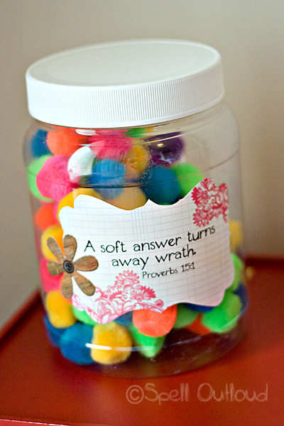The picture above is what I hope our jar looks like at the end of the week. I placed all the colored pom poms (soft words/soft answers) in a container next to the jar. Then I encouraged all the kids to be listening for when one of their siblings used soft words/soft answer when talking with each other. This meant instead of automatically using an accusing tone with each other, or an annoyed tone, that they used a peaceful, gentle tone. Instead of blaming and accusing right away, that they took the time to talk it out nicely to find out all the facts first. If they or their siblings were trying, then they could add a colored pom pom into the jar. They could even catch me trying to use soft answers too. I’m praying that this exercise will help all of us, mom and dad too, realize how we are relating with each other with our words. That we will be more aware of the tone we use, the attitude behind our words and that our conversations with each other will be more loving.